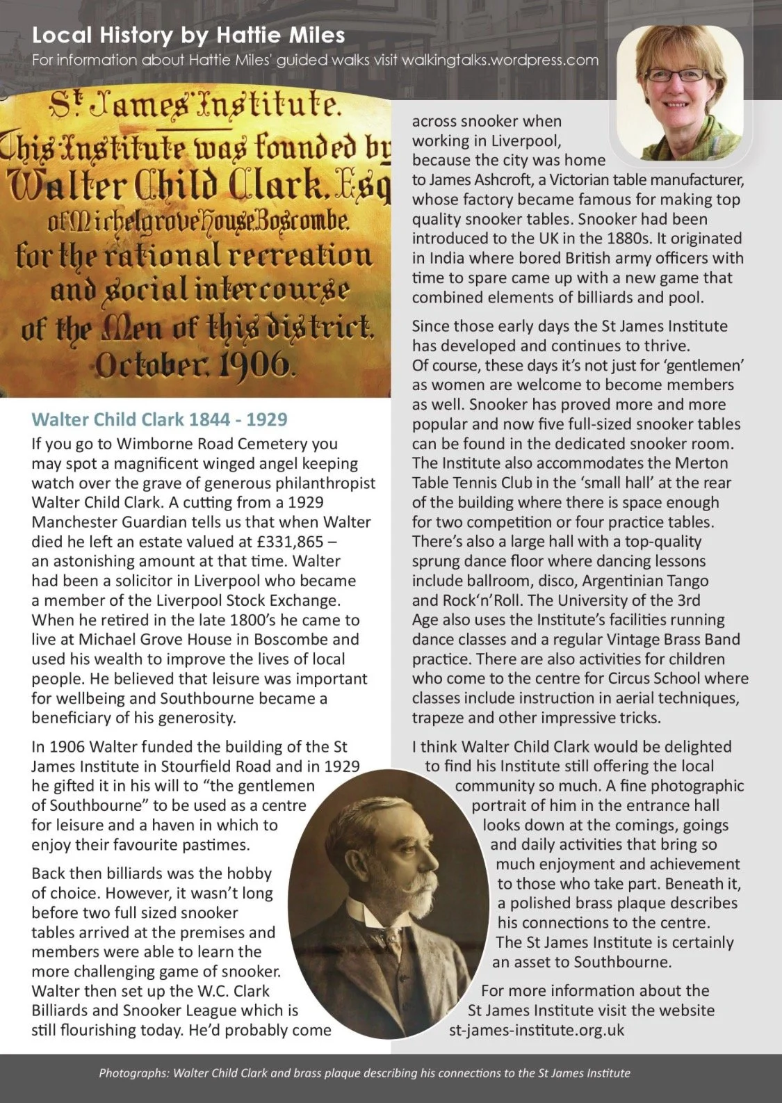 We are grateful to Hattie Miles and her Talkingwalks blogs for her research about Walter Clark and the history of St James Institute